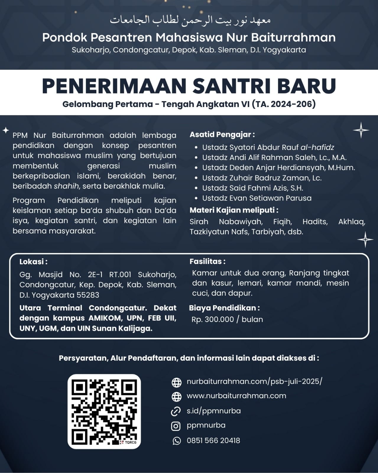 PPM Nur Baiturrahman juga membuka kesempatan bagi yang ingin kuliah sekaligus belajar agama. PPM Nur Baiturrahman membuka Penerimaan Santri Baru Gelombang Pertama untuk Tengah Angkatan VI.