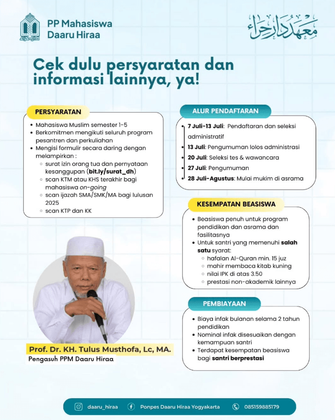 Pondok pesantren Daaru Hiraa di bulan Juli 2025 ini sedang membuka Pendaftaran Santri Baru. Silahkan dapat dicek disini :